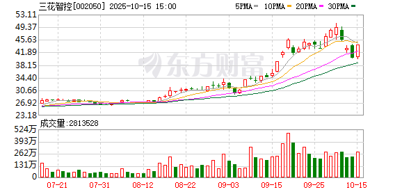 证券时报·数据宝统计显示,三花智控今日收盘价为44.18元,上涨10.01%,日换手率为7.64%,成交额为119.80亿元,全天主力资金净流入18.25亿元,近5日该股累计下跌8.78%,近5日资金合计净流出27.77亿元。